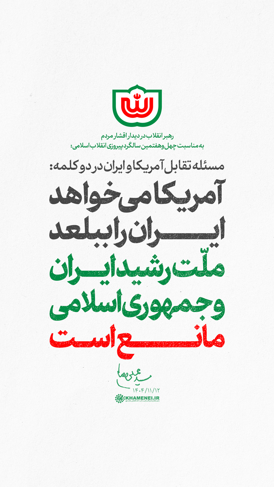 حضرت آیتالله خامنهای نیز امسال و یک روز پس از راهپیمایی تاریخی و با شکوه ۲۲ بهمن، در پیامی تلویزیونی ضمن تشکر از ملّت عزیز ایران و نثار درود بر یکایک آنان، همان حرف و مطالبه فردای پیروزی انقلاب را تکرار کردند؛ «سعی بشود که اتّصال و انسجام ملّی را حفظ کنیم؛ همهی ما سعی کنیم. این انسجام ملّی خیلی قیمت دارد، خیلی باارزش است.» ۱۴۰۴/۱۱/۲۳