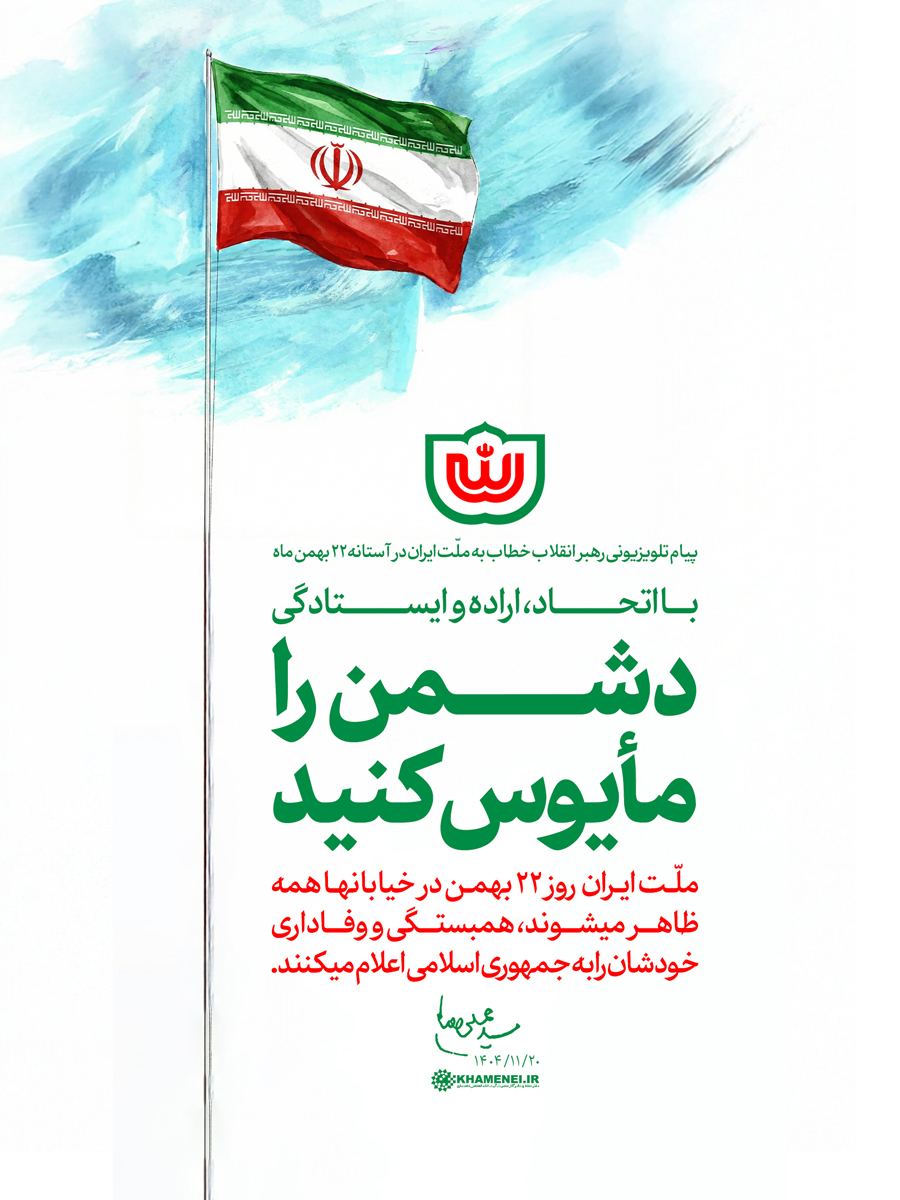 رهبر معظم انقلاب اسلامی در پیامی خطاب به ملت عزیز ایران گفتند: در روز ۲۲ بهمن امسال کار بزرگی انجام دادید؛ ایران را سربلند و دشمن را مأیوس کردید.