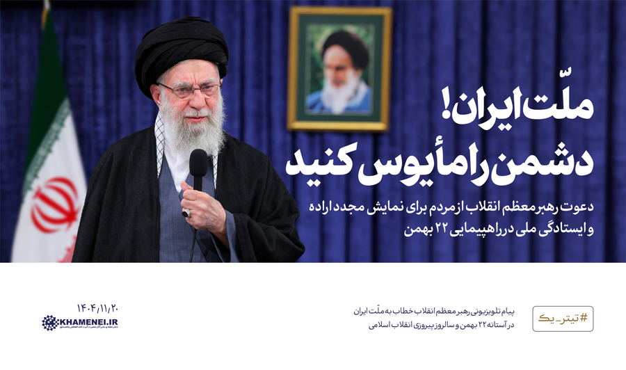 رهبر معظم انقلاب اسلامی عصر امروز (پنجشنبه) در پیامی تلویزیونی، اجتماع عظیم و میلیونی مردم در روز ۲۲ بهمن را مایه سربلندی و افزایش قدرت و عزت جمهوری اسلامی و موجب یأس دشمنان از تسلیم ملت ایران خواندند و با تشکر از آحاد شرکتکنندگان در این حرکت بزرگ، همگان را به حفظ انسجامِ ارزشمند ملی فراخواندند.